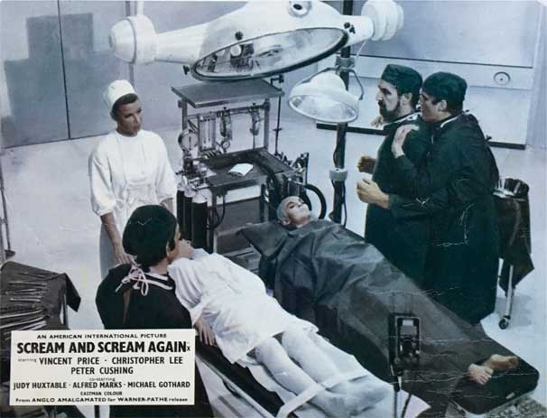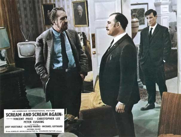 Lustig ist’s ja, dass Cushing in seiner kurzen Szene sogar noch motivierter wirkt als seine Kollegen. Christopher Lee schaut in seinen Szenen (auch nicht sehr viele, aber zumindest mehr als Cushings) durchgehend bedröppelt rein, viel Herzblut verschüttet er an diese undankbare Rolle sichtlich nicht. Vincent Price hingegen liefert sein typisches Minenspiel, das wie immer unterhält, doch auch ihm merkt man an, dass er mit dem Skript nicht sonderlich viel anfangen konnte. Summa Summarum schlussfolgert der geneigte Fan dieser Stars, das keiner von ihnen überhaupt viel Screentime hat und dass zumindest Cushing und Lee nur wegen ihres Namens gecastet wurden (ok, dies war bei Lee öfter der Fall, bzw. nahm der gute Herr in diesen Jahren so manch kurzen Auftritt des Gagenchecks wegen mit. Siehe Tunnel der lebenden Leichen).