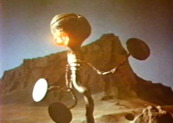 Stattdessen sitzt der Streifen zwischen den Stühlen. Für einen zünftigen Monster-Reißer reicht es nämlich auch nicht. Dafür gibt’s zu wenig „Action“ und Monster ehedem schon gar nicht. Die seltsame Roboter-Apparatur sieht zwar ganz fein aus, tut aber sowieso nicht viel, und die eine Gewaltszene, in der einer der Astronauten zu Asche wird, macht den Braten auch nicht mehr fett. Dafür allerdings punktet der Film, allerdings auch eher unfreiwillig und das nur aus heutiger Sicht, mit seinem Look. Natürlich ultra-billig und teils auch dem schlechten Print der Amazon-Version verschuldet, haftet dem ganzen dieser obskure B-Movie Charme an, den ich einfach so gerne habe. Manchmal sind die Sets nur allzu gut als winzige Studiosets zu erkennen (die ebenfalls oft recycelt werden), manchmal sind die Mars-Wüsten aber durchaus gekonnt in Szene gesetzt. Zusammen mit der unterschwelligen Musik ergibt das, wenn zumindest mal keine Disko-Musik auf der Tonspur zu vernehmen ist, eine angenehm mystische Atmosphäre, die zu der obskuren Story passt.